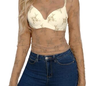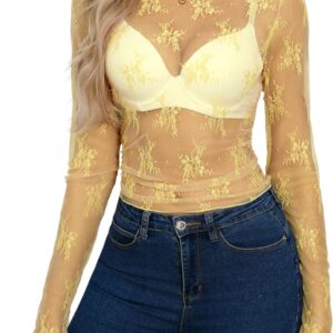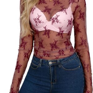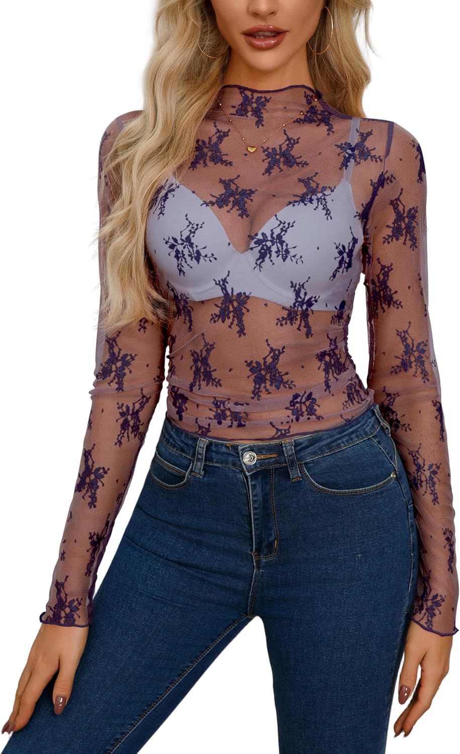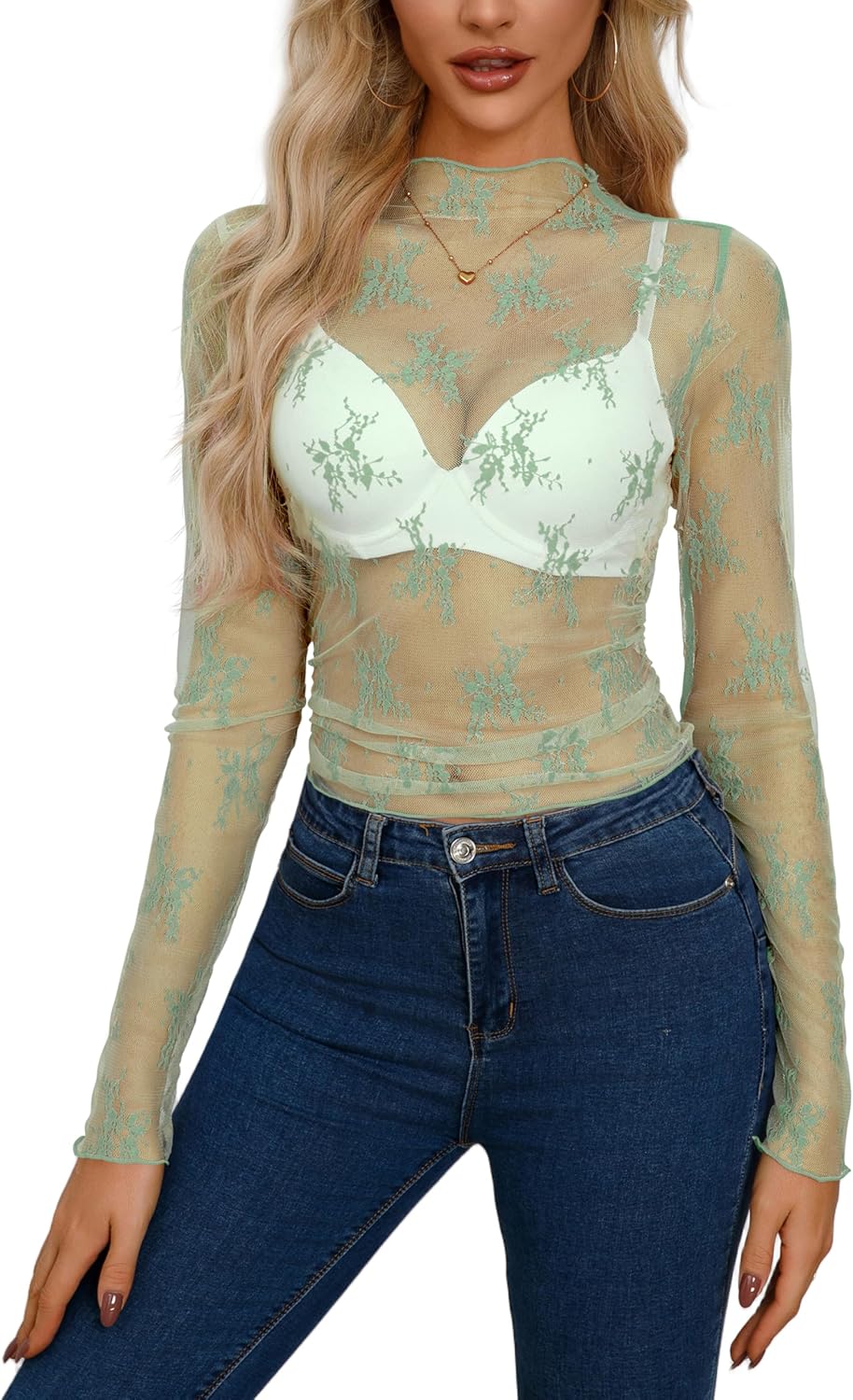 AISEW Womens Mesh Sheer Long Sleeve Crop Tops Mock Neck Sexy See Through Tee Shirts Lace Floral Y2K Layering Top Blouses