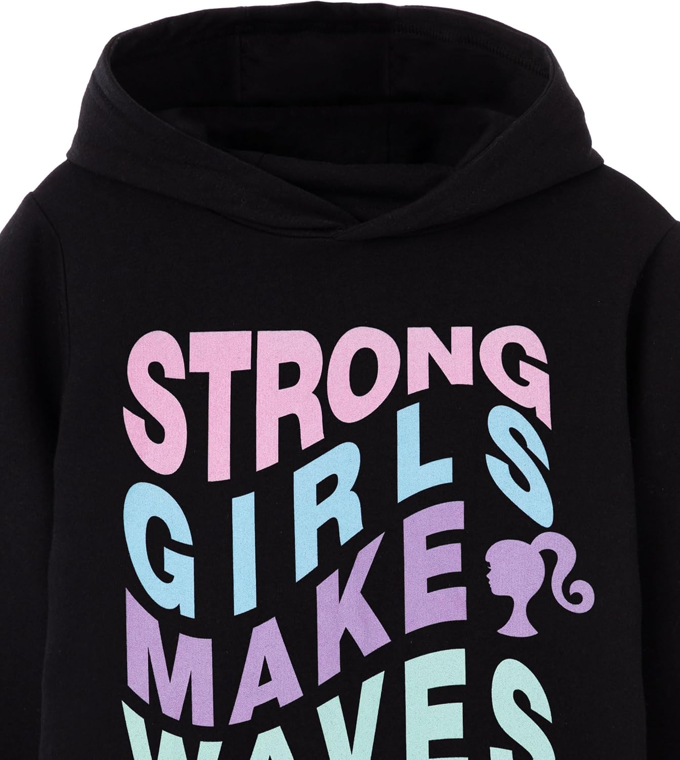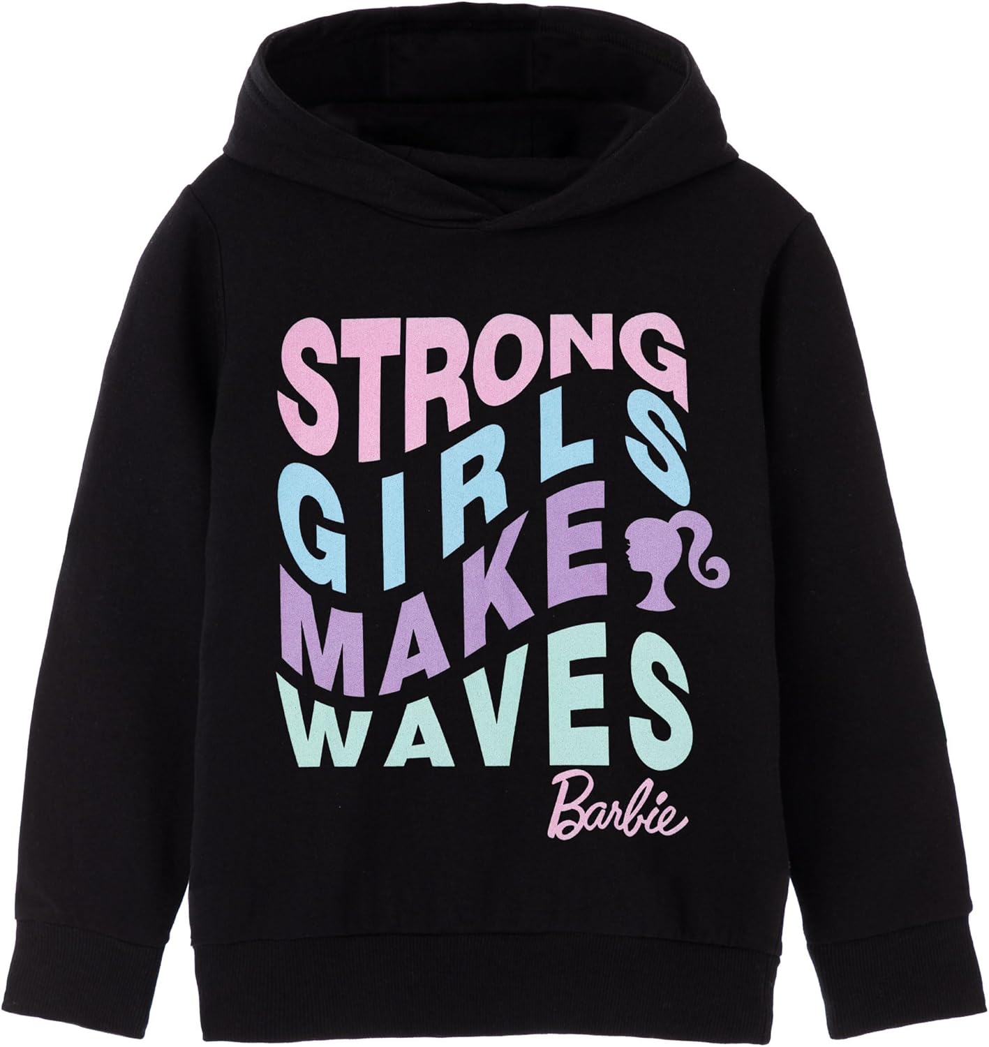 Empower your little girl with our Barbie Girls Black Hoodie. Featuring the inspiring slogan “Strong Girls Make Waves,” this hoodie encourages strength and confidence. It’s the perfect way for her to showcase her inner power while staying comfortable and stylish. Made with high-quality materials, this hoodie offers a cozy fit that will keep her warm and comfortable all day long. As an authentic Barbie merchandise, it guarantees the highest quality and attention to detail. Let her embrace her strength and make a fashion statement with this empowering Barbie hoodie.