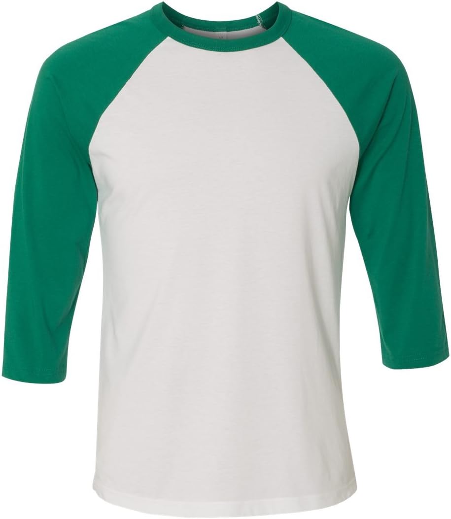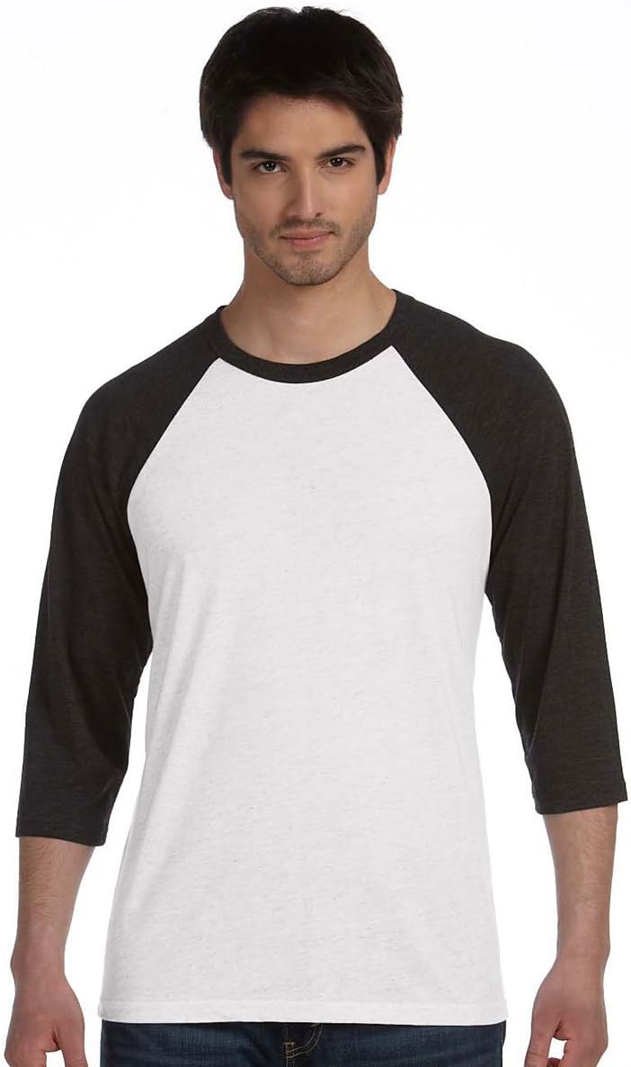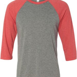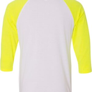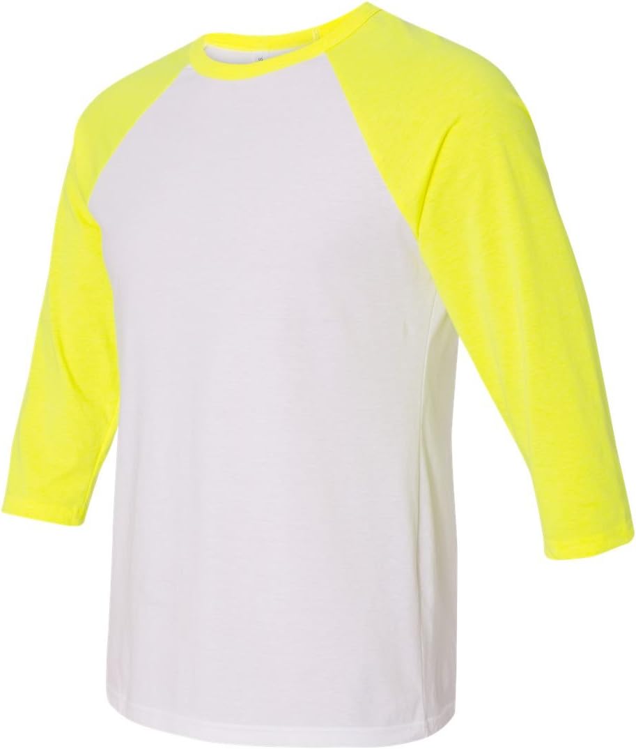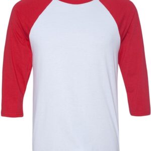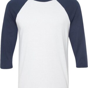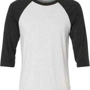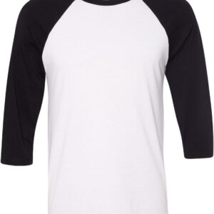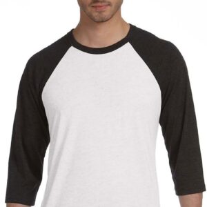 50% Polyester, 25% Airlume Combed Ringspun Cotton, 25% Rayon. Fabric: Tight Knit, Triblend. Design: Contrast. Sleeve-Type: 3/4 Sleeve, Contrast Sleeves, Raglan. Neckline: Contrast Collar, Crew Neck. Fabric Technology: Soft. Side Seams, Tearaway Label. Fit: Modern. 130gsm. Sustainability: Fair Labor Association, WRAP Certified. Suitable for: Printing. M: 41 in. XL: 49 in. S: 37 in. L: 45 in. XXL: 53 in. XS: 34 in.