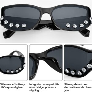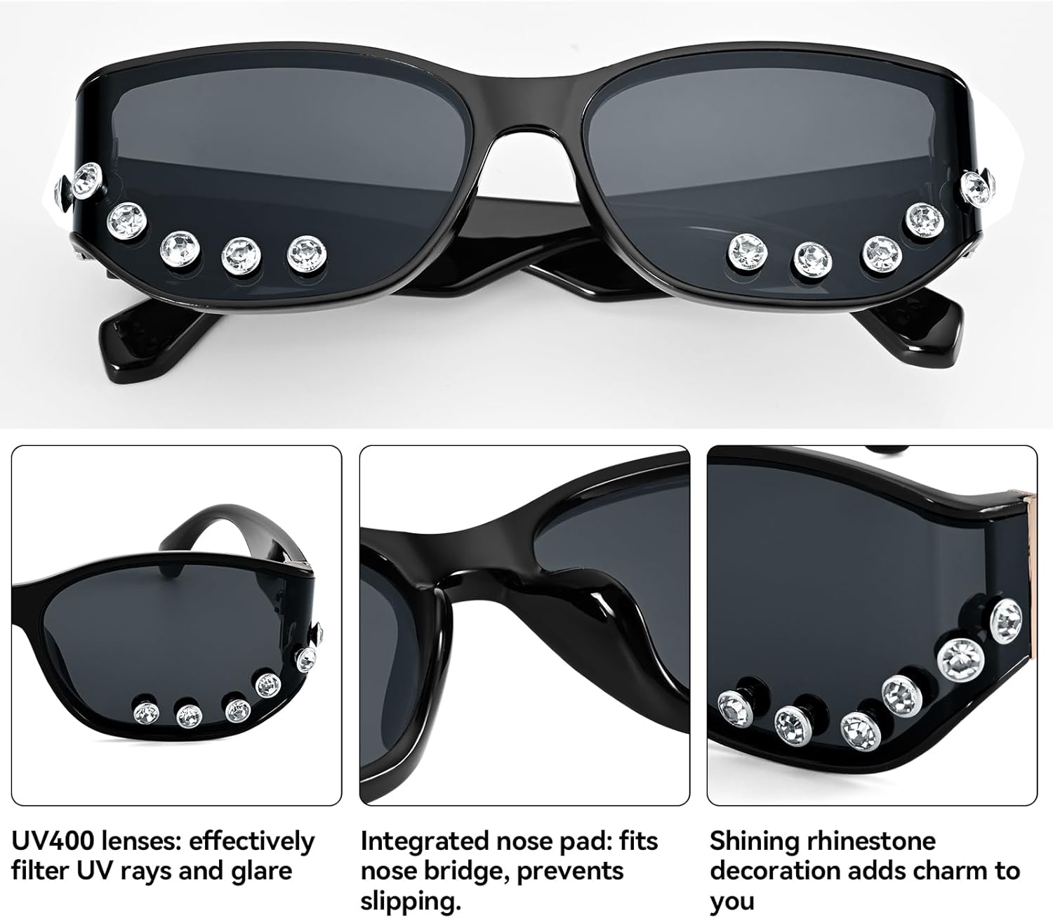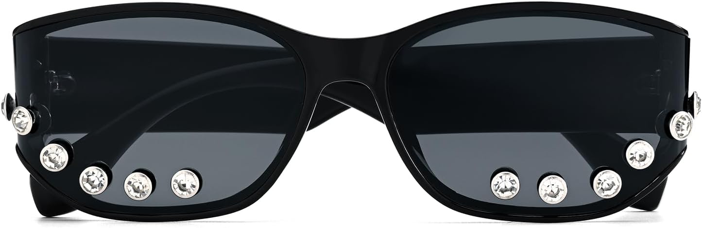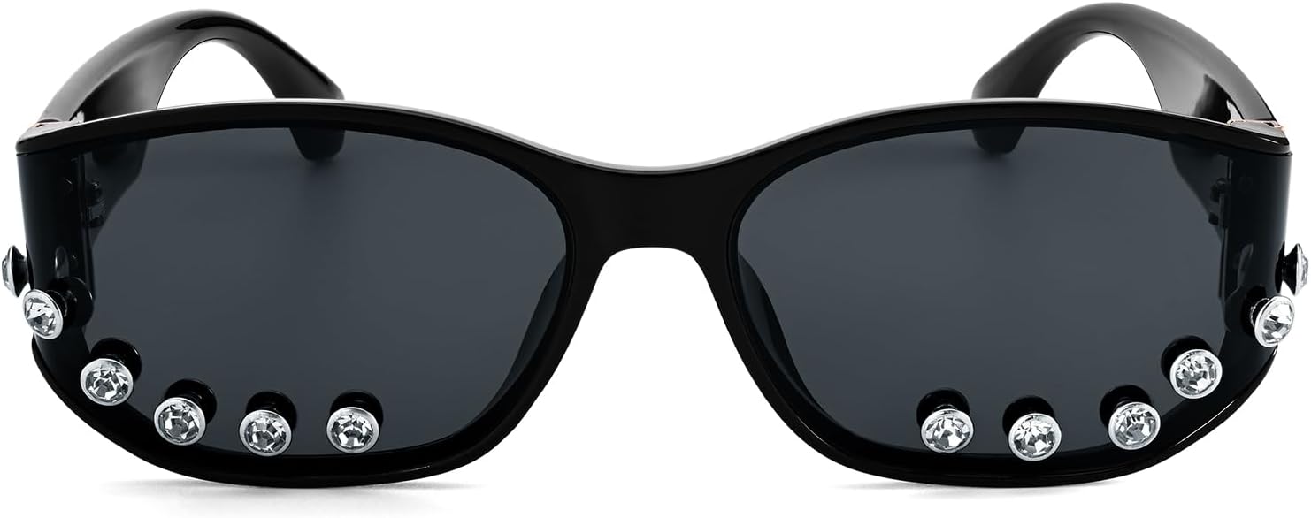 - Shine bright with our rhinestone sunglasses. The delicate, sparkling crystal details along the bottom rim add a touch of glamour and sophistication, perfect for anyone who loves to make a statement These aren’t just sunglasses; they’re a dazzling fashion accessory that elevates any look.