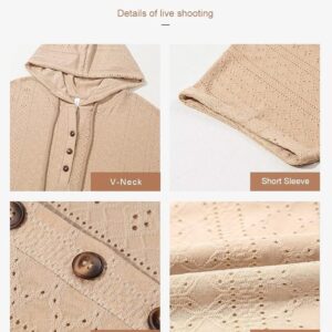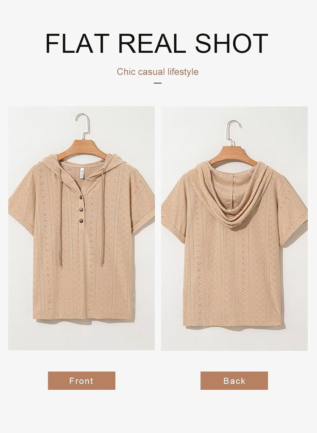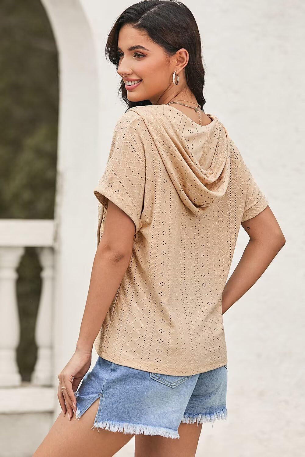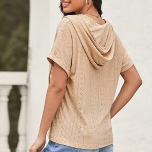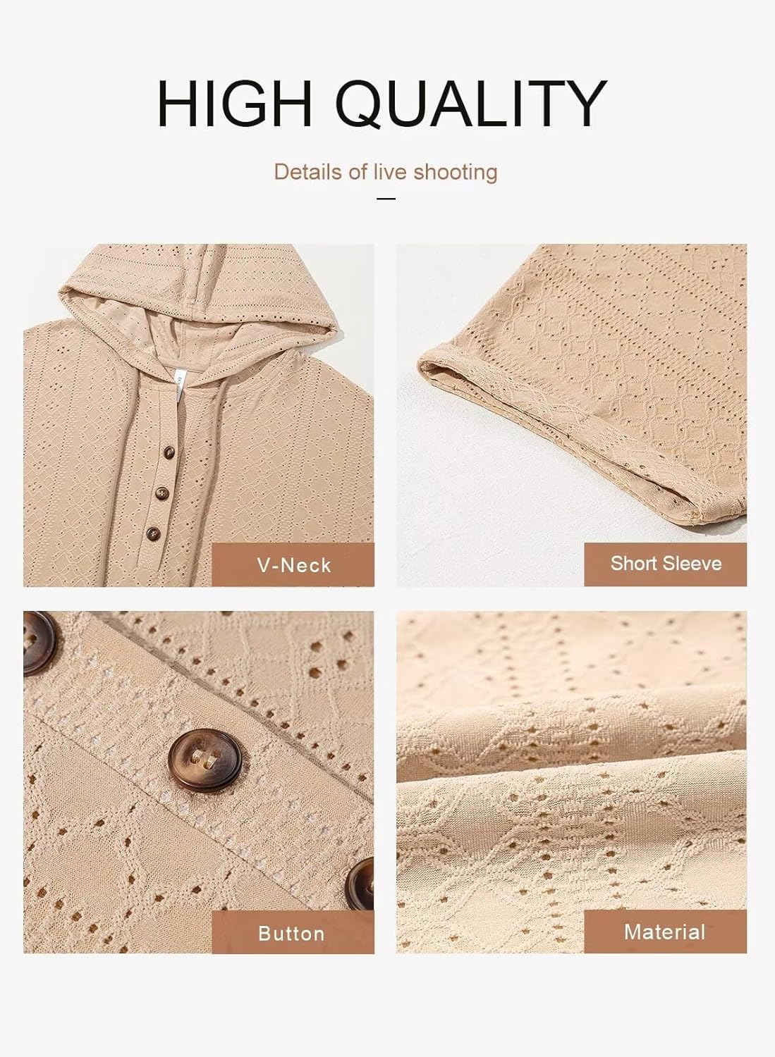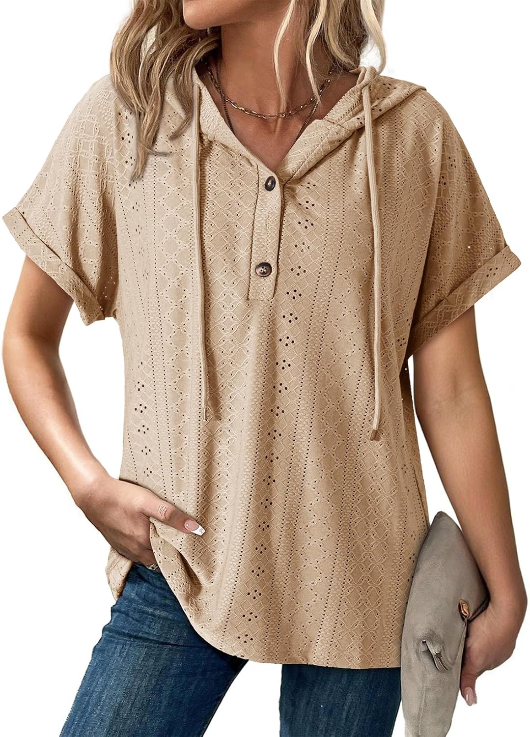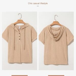 Dokotoo Sweatshirts for Women Spring Summer Hollow Out Hoodies Drawstring Button V Neck Short Sleeve Pullover Sweatshirt