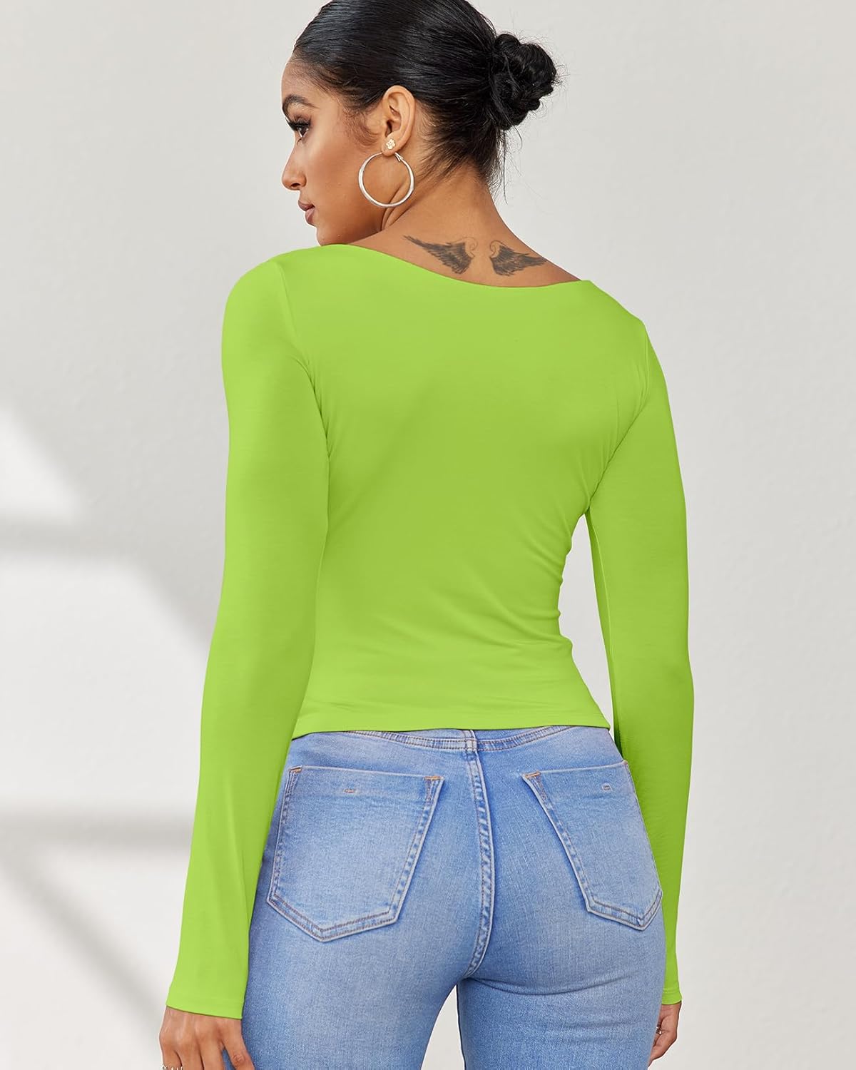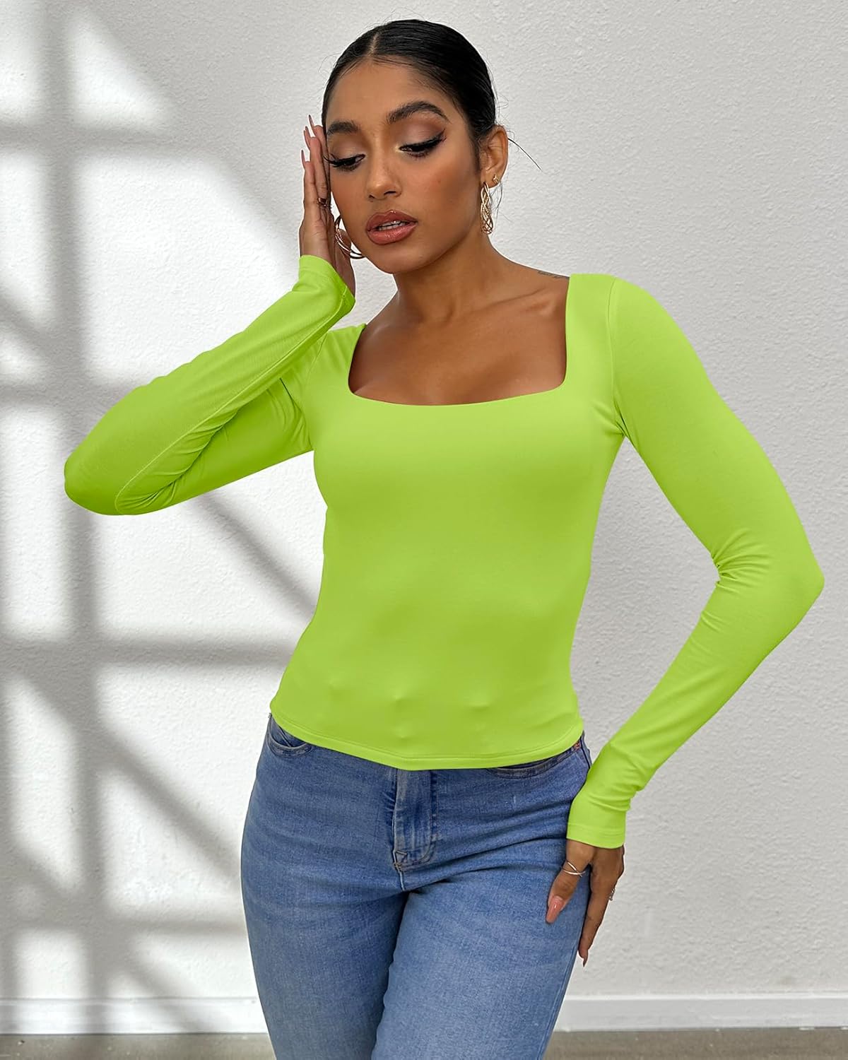 This basic crop t shirt for women sexy casual, double layer, long sleeve, square neck, Basic womens workout tops. Cute and trendy. 92% Rayon + 8% Spandex, stretchy and breathable double layer fabric, lightweight, super soft and comfortable. Healthy and body friendly, suitable for a long day wear, Fits wear in different occasion.