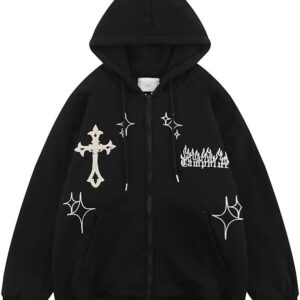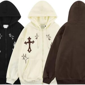 Features: Women's retro hoodies, black men's retro hoodies, long sleeves, cross patterns, butterflies, skull printed tops, solid color super Dalian hoodies, brown zippered hoodies and zippers, two pockets, loose fit, irregular length, 90's fashion y2k punk style, aesthetic sweatshirts retro, 90's electronic girls' pullover street wear.