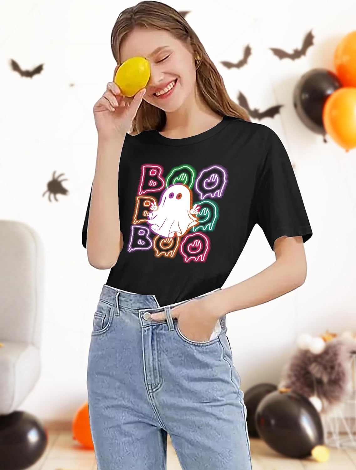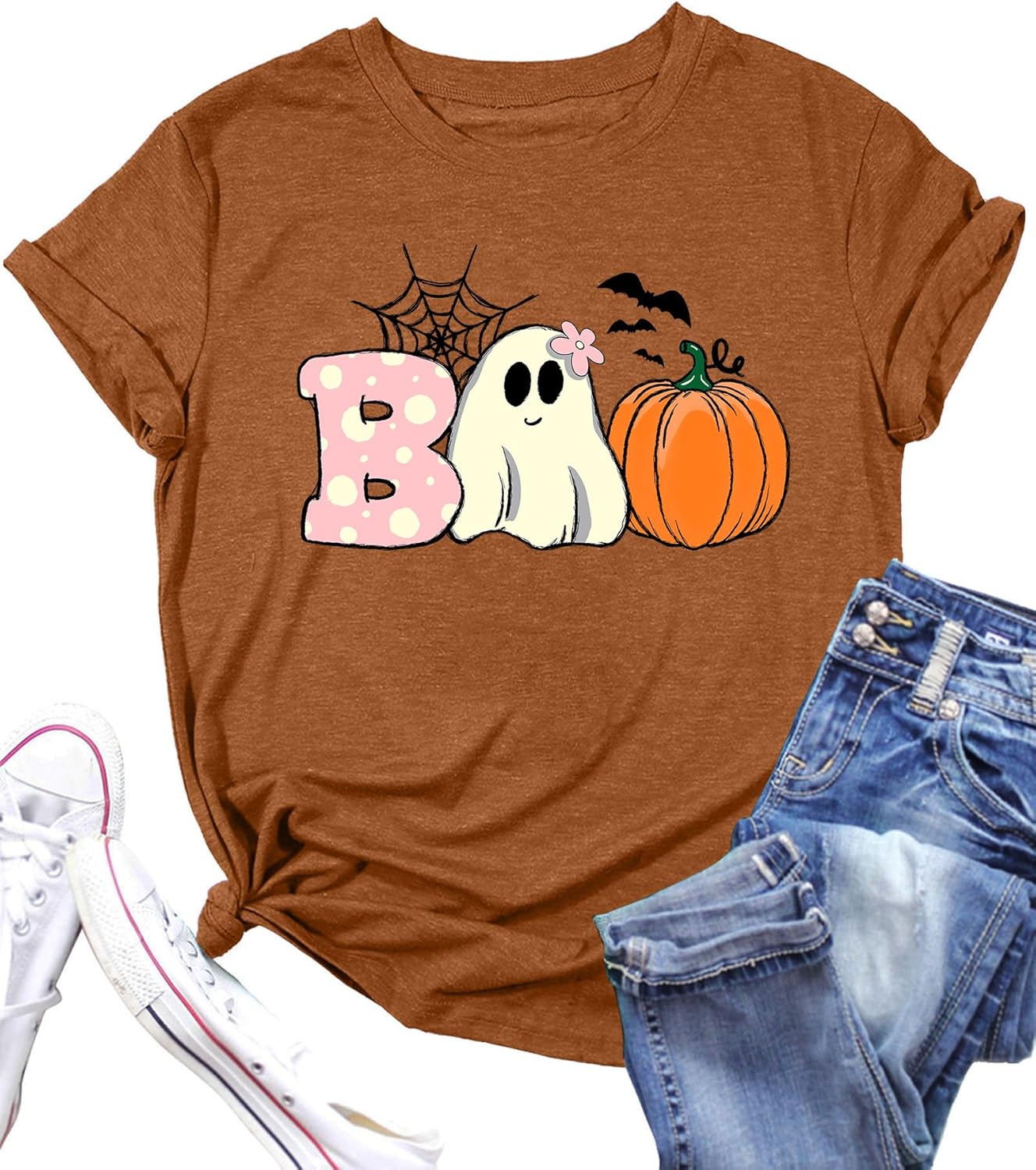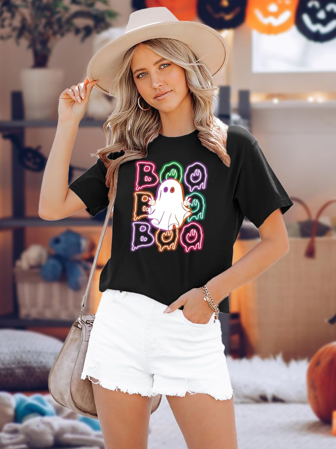 Halloween Shirts for Women Boo T Shirt Cute Ghost Graphic Tees Halloween Spooky Season Short Sleeve Tee Tops