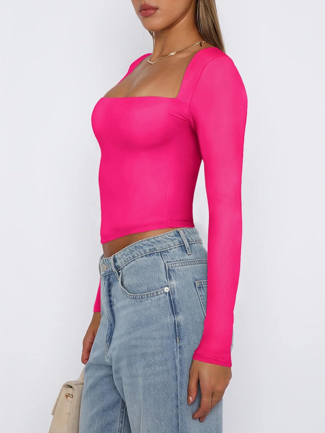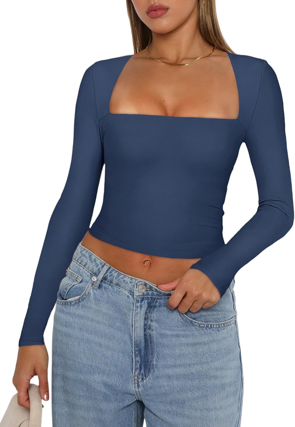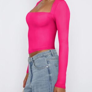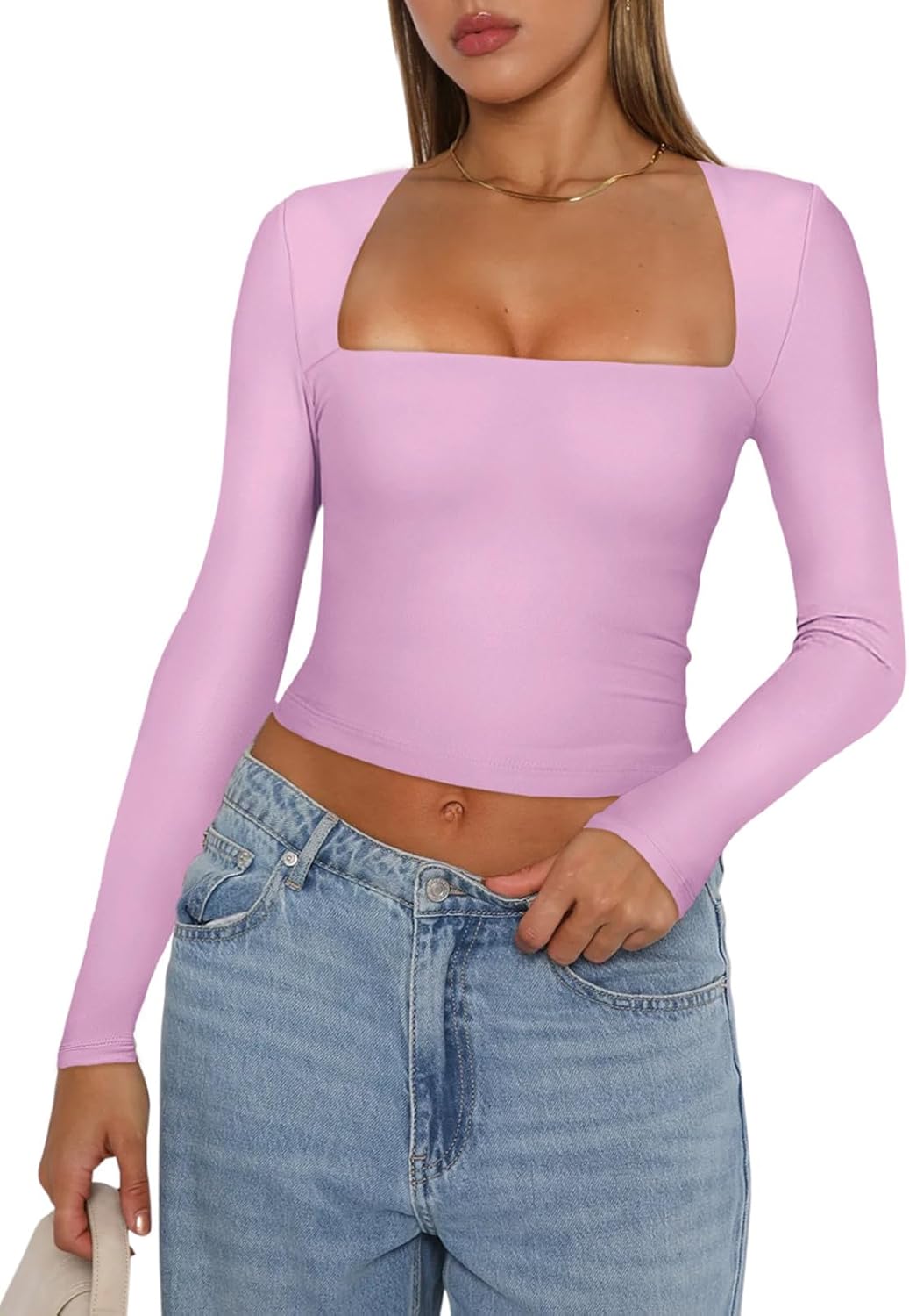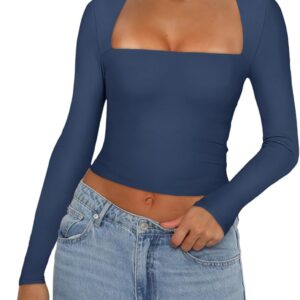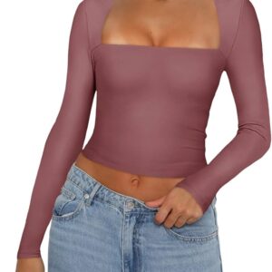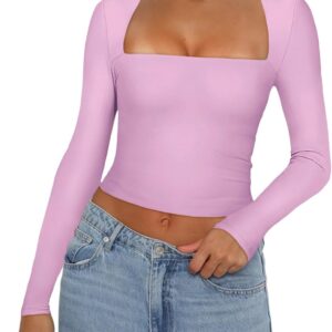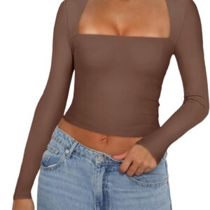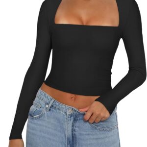 REORIA Women’s Basic Sexy Square Neck Long Sleeve Y2K Going Out T Shirt Crop Top