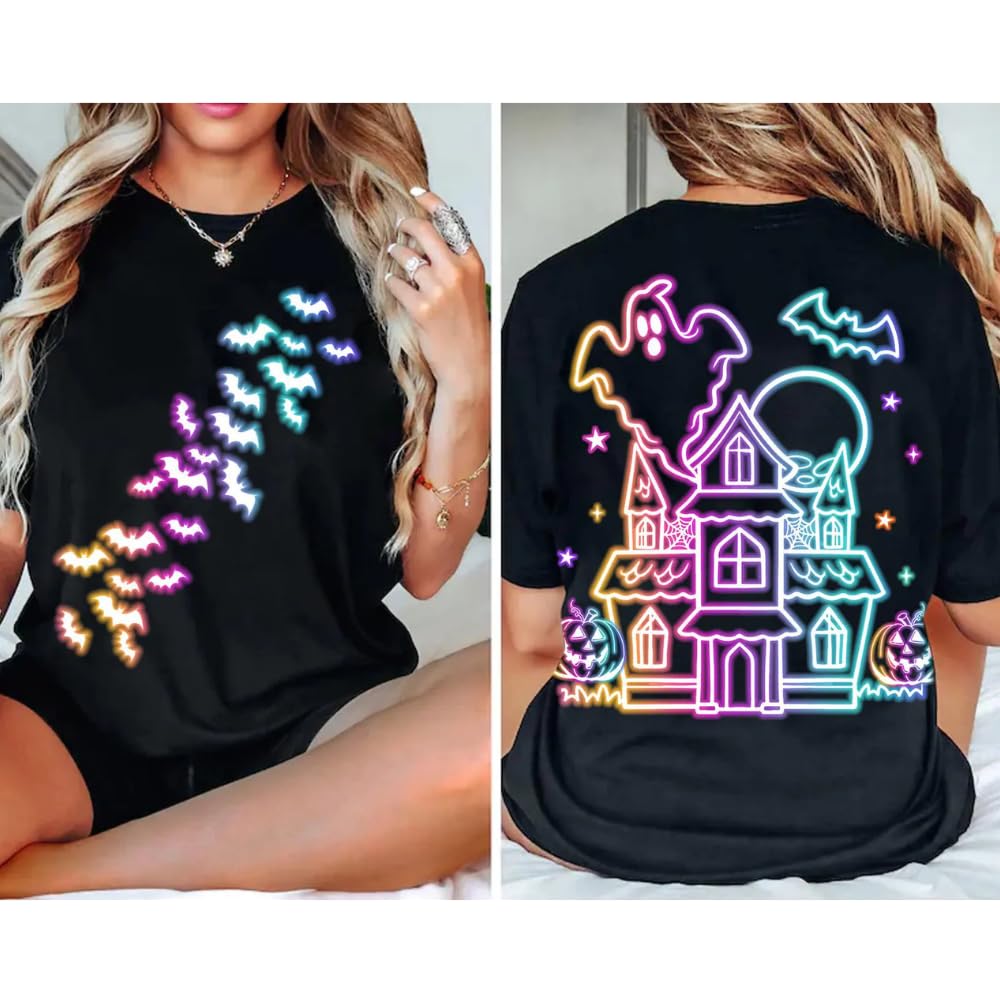 - 🕸️ This spooky season shirt combines vintage haunted house graphics with neon bat details for a fun and cozy fall outfit.
