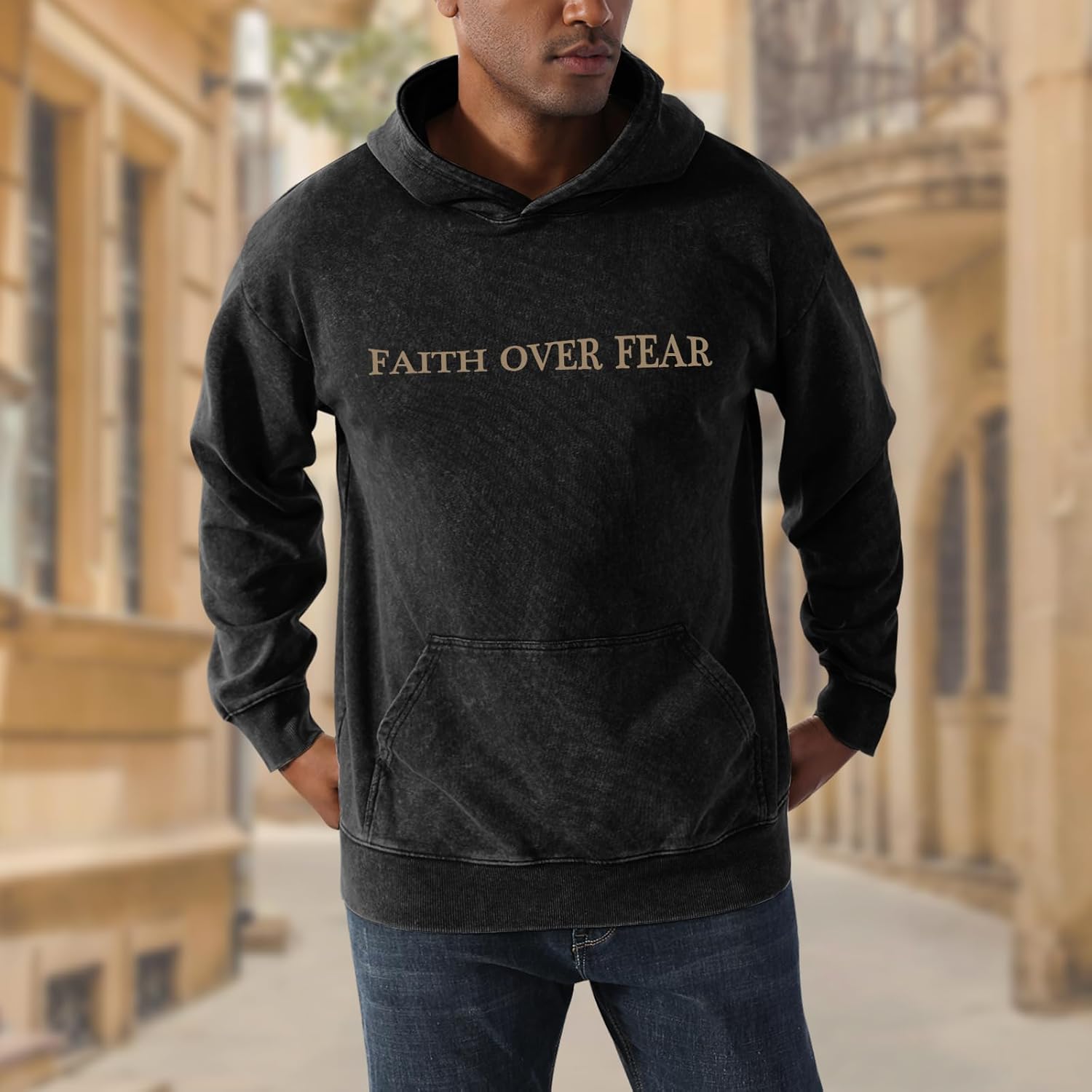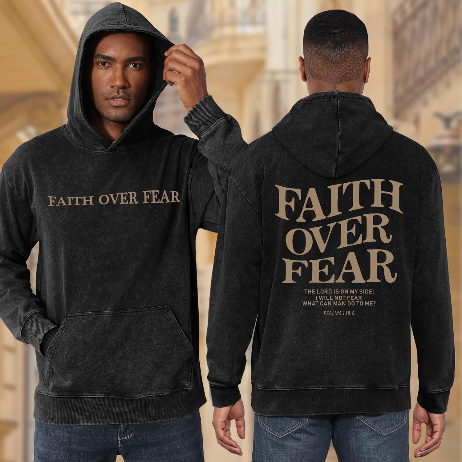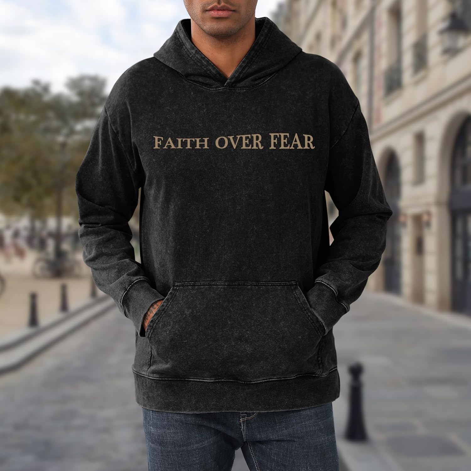 Weetiotio Christian Faith Over Fear Hoodies for Men Jesus Religious Graphic Sweatshirt Bible Verse Acid Wash Pullover Hoodie quantity