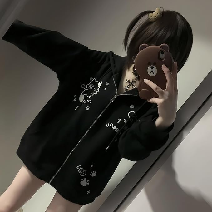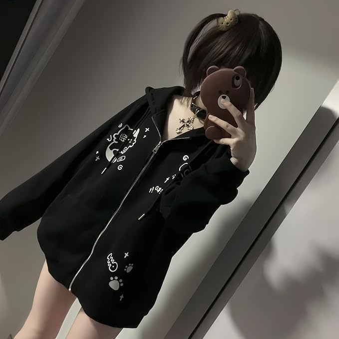 Xojbzoo Women’s Y2K Zip-Up Hoodie Oversized Streetwear Cat Ear Cute Cartoon Graphic Harajuku Kawaii Sweatshirt
