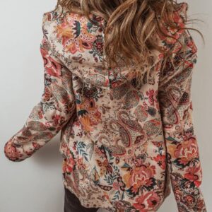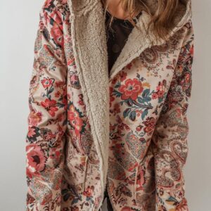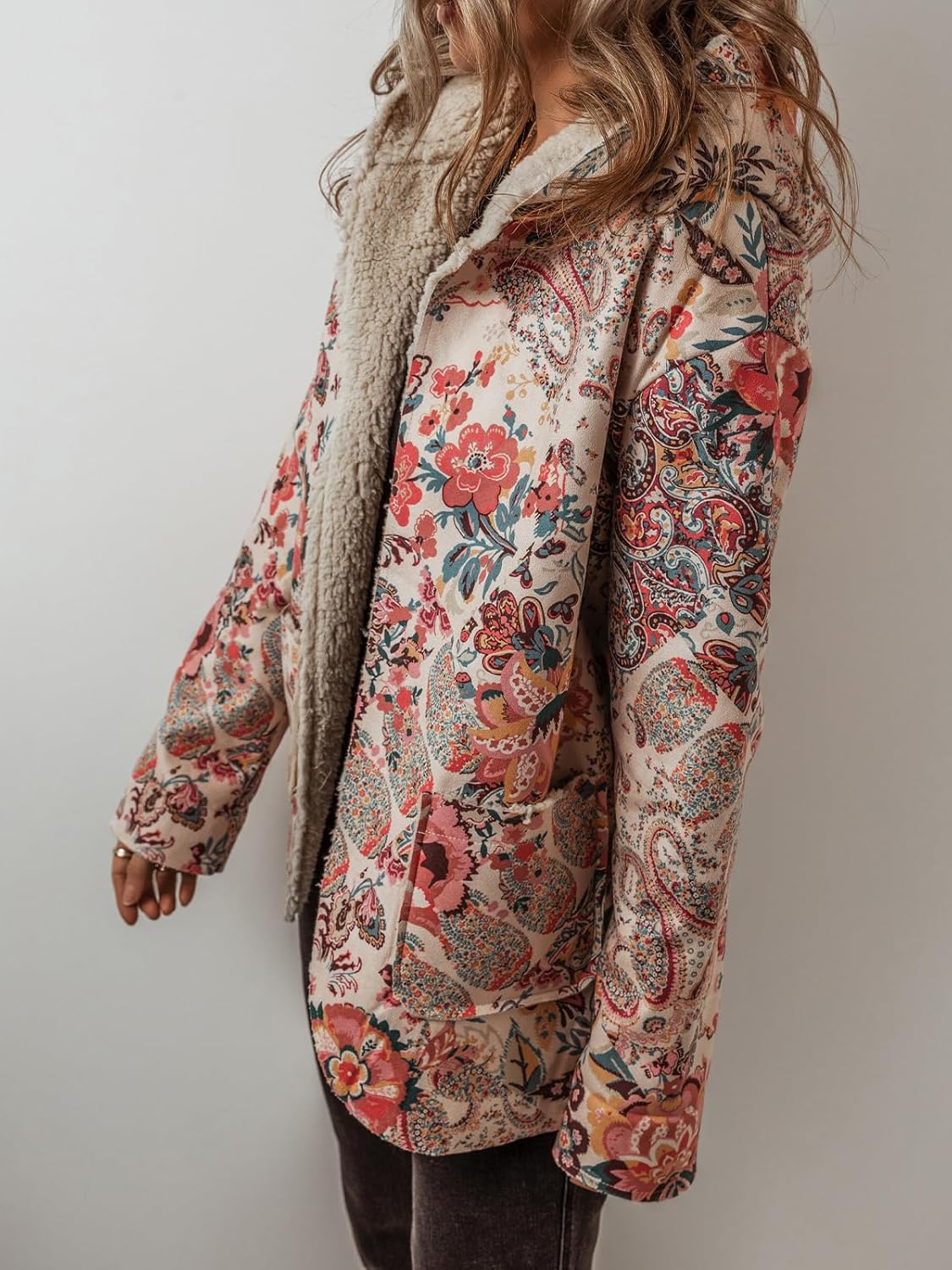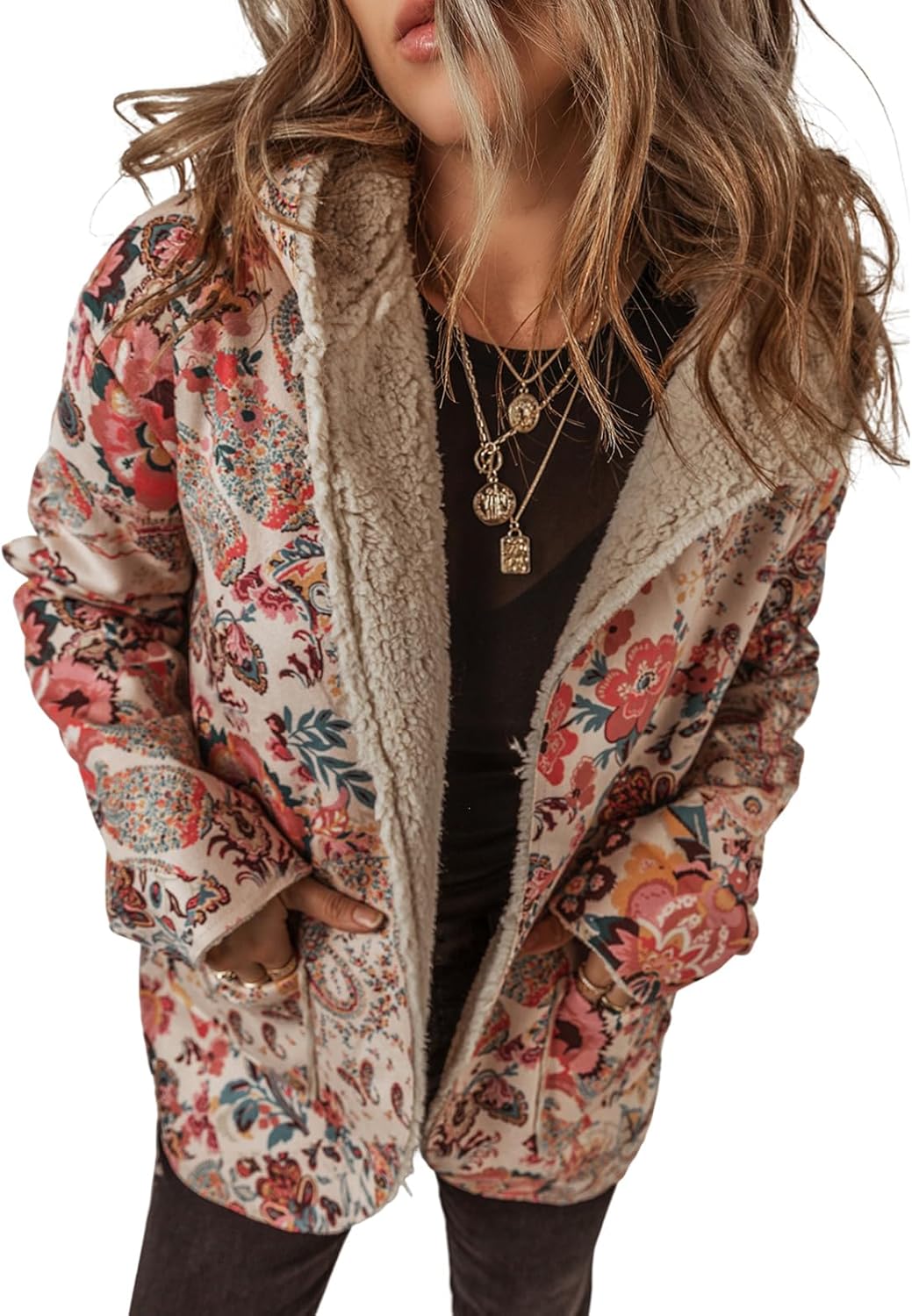 YIGAMA Women’s Winter Plush Hooded Jacket Retro Floral Prints Fleece Lined Open Front Coat with Big Pockets